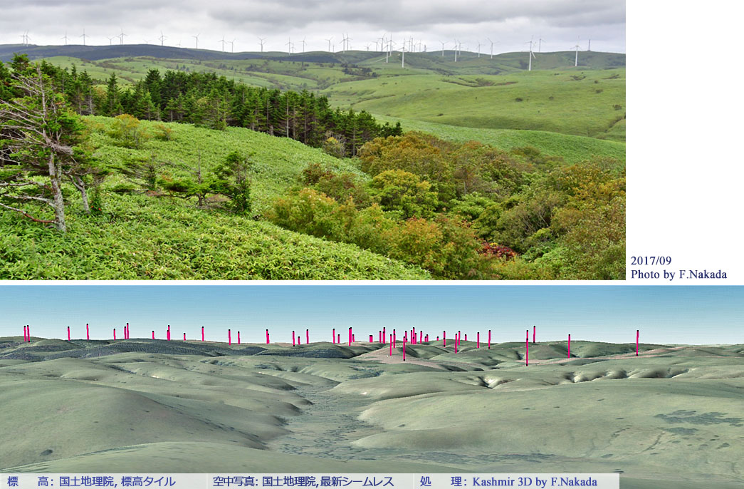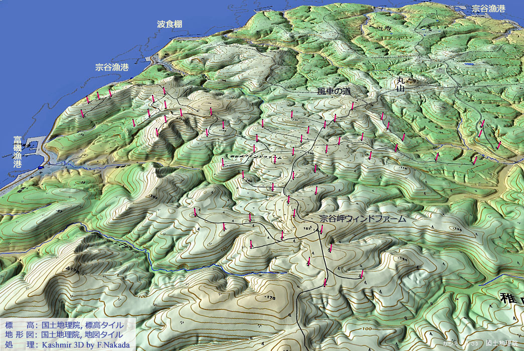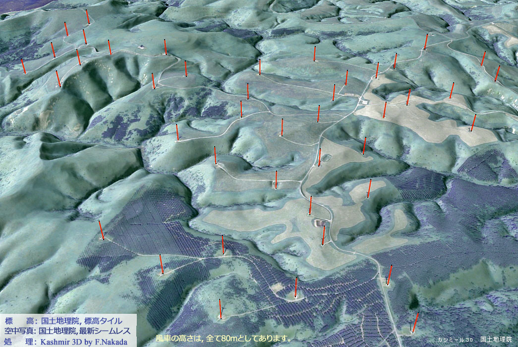 ![]() 空中写真や地形図を三次元化しても,各風車の高さを実感することができないので,三次元マーカーを描画してみました。 |
