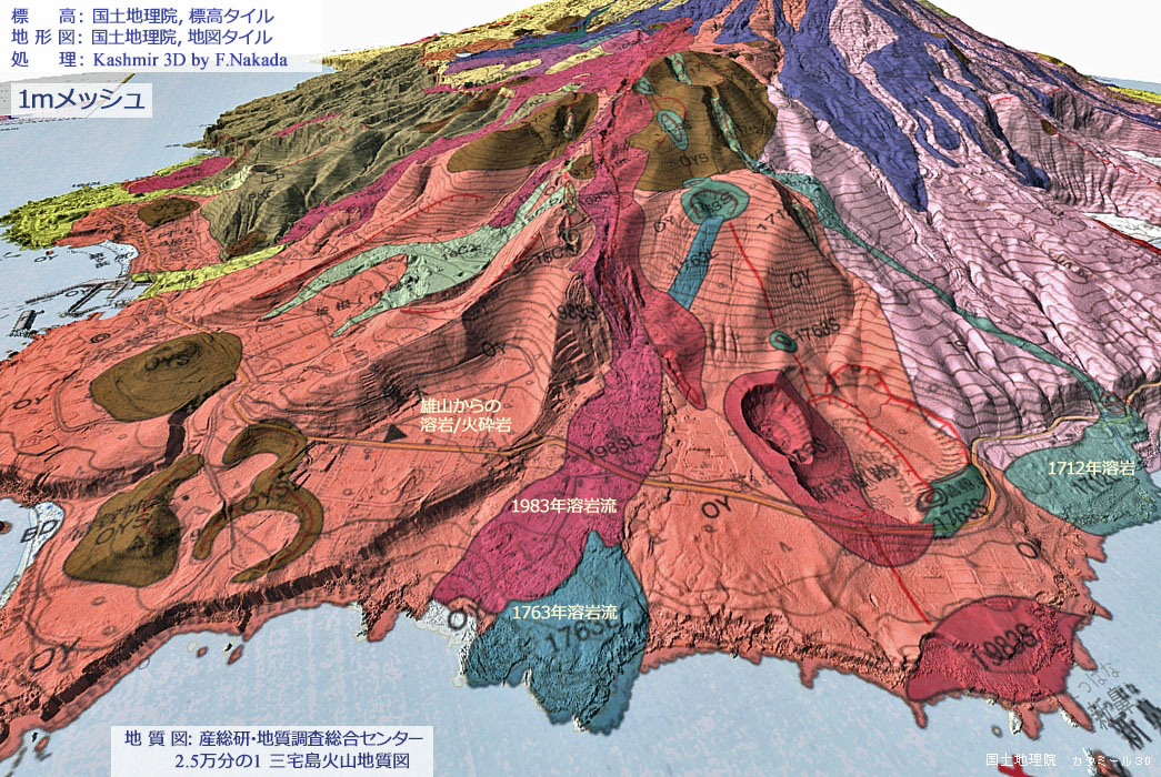 1mメッシュの「三宅島火山地質図」上でマウスクリックすると「5mメッシュを使用した三次元火山地質図」を表示します。 ダブルクリックで元に戻ります。![]() 溶岩が流れて来た様子がよくわかります。 海成段丘が造りだした崖なども同様です。 |